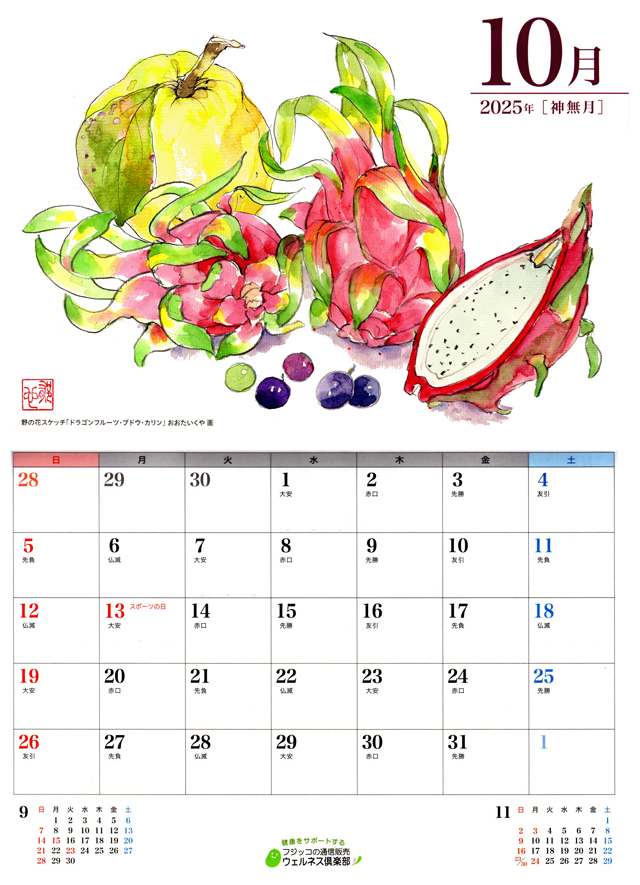 2025.10 フジッコ ウエルネス倶楽部 四季の花絵カレンダー おおたいくや画 果物(ドラゴンフルーツ・カリン・ブドウ) |
